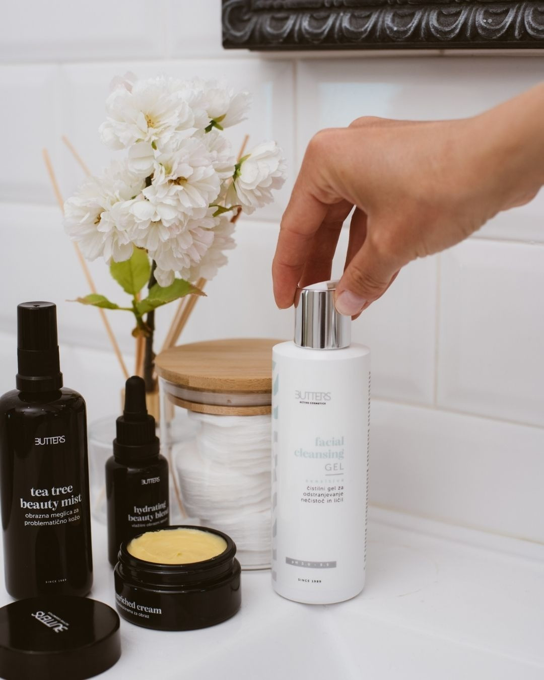 Čisticí gel na obličej Butters nabízí mírné čištění s optimálním pH 5,0–5,5, které zachovává přirozenou rovnováhu pokožky, aniž by způsobovalo její vysušení nebo pnutí. Toto složení účinně odstraňuje pot, kožní maz, make-up a dokonce i krémy s UV ochranou, zanechává pokožku svěží, jemnou a připravenou na další péči. Obohacený o více než 99,5 % přírodních ingrediencí, vyživuje a obnovuje kožní bariéru prostřednictvím směsi pšeničných proteinů, betainu, glycerinu a organického oleje ze švestkových semínek. Další rostlinné látky, jako je heřmánek, marshmallow, bisabolol a gotu kola, zklidňují a podporují citlivou pokožku, zatímco vitamin E a aminokyseliny, jako je arginin, pomáhají chránit před stresem z okolního prostředí a podporují zdraví pokožky.