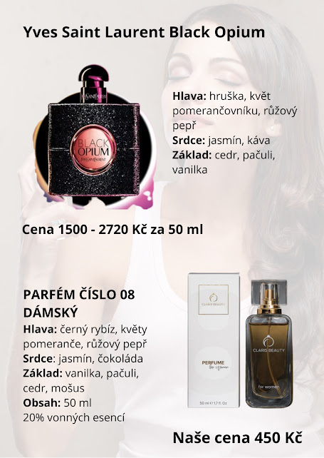 Parfém č. 8 ( inspirace Yves Saint Laurent - Black Opium )hlava: černý rybíz, květy pomeranče, růžový pepřsrdce: jasmín, čokoládazáklad: vanilka, pačuli, cedr, mošusBalení: 50 ml20% vonných esencí