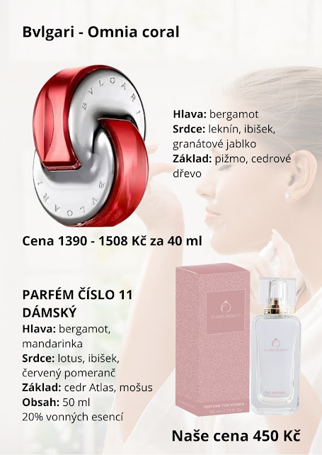 Parfém č. 11 ( inspirace Bvlgari - Omnia coral )hlava: bergamot, mandarinkasrdce: lotus, ibišek, červený pomerančzáklad: cedr Atlas, mošusBalení: 50 ml20% vonných esencí