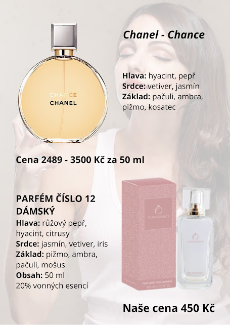 Parfém č. 12 ( inspirace Chanel - Chance )hlava: růžový pepř, hyacint, citrusysrdce: jasmín, vetiver, iriszáklad: pižmo, ambra, pačuli, mošusBalení: 50 ml20% vonných esencí