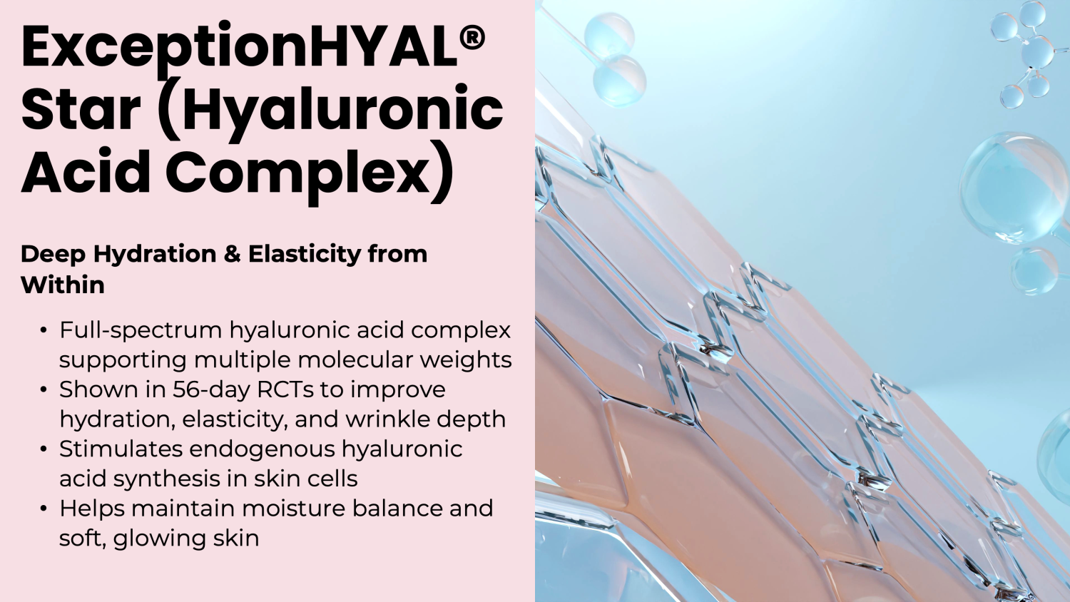 • Kyselina hyaluronová (ExceptionHYAL® Star): Optimalizované molekulové hmotnosti dosahují jak epidermálních, tak dermálních vrstev Obnovte vlhkost, hladkost a plnost zevnitř.
