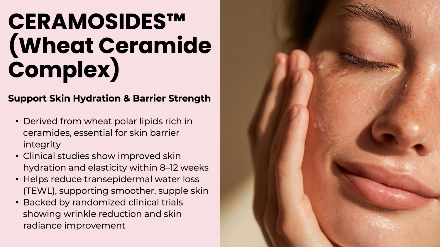 • CERAMOSIDY™ (patentovaný derivát pšenice ceramidy) obnovují lipidovou bariéru, která zabraňuje ztrátě vody.