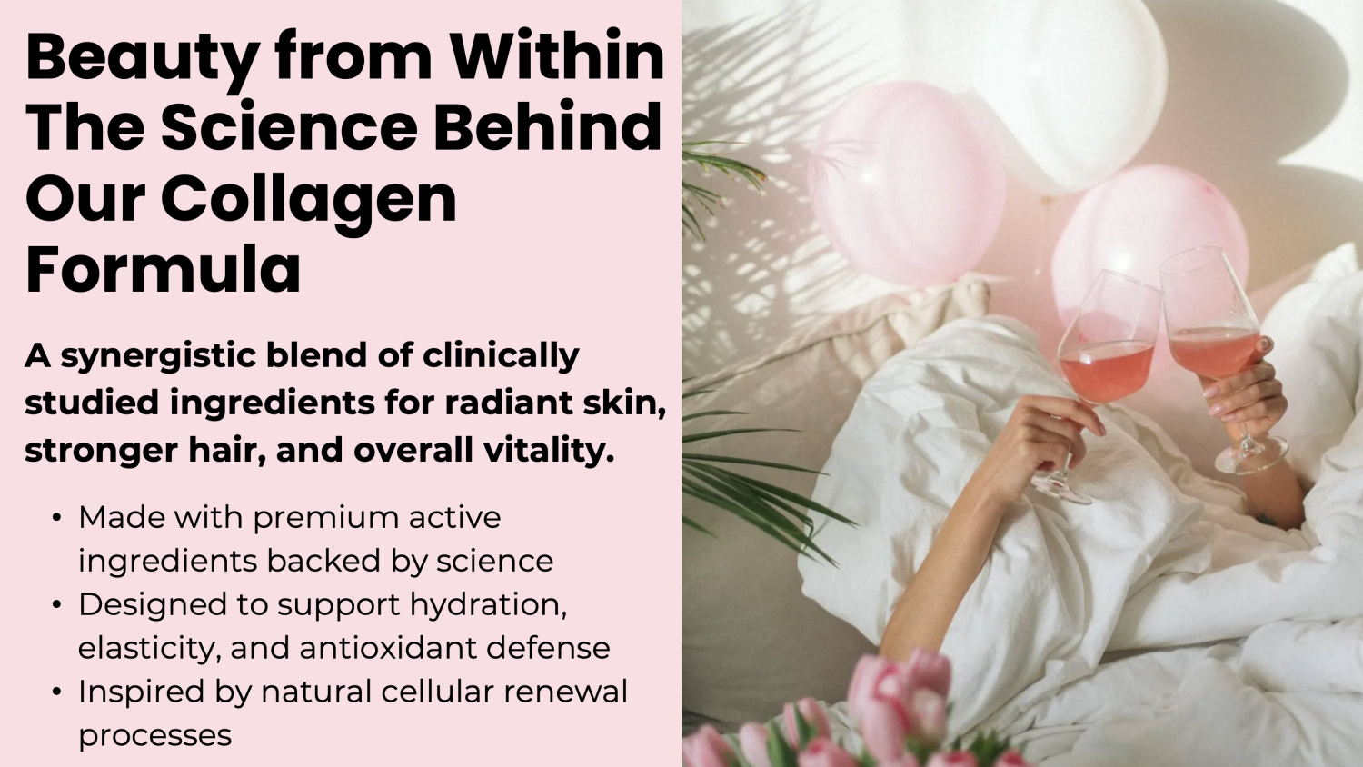 Dohromady Tyto složky vytvářejí každodenní rituál obnovy – podporují pružnost pokožky, hydratace, zdraví kloubů a celková vitalita zevnitř ven.